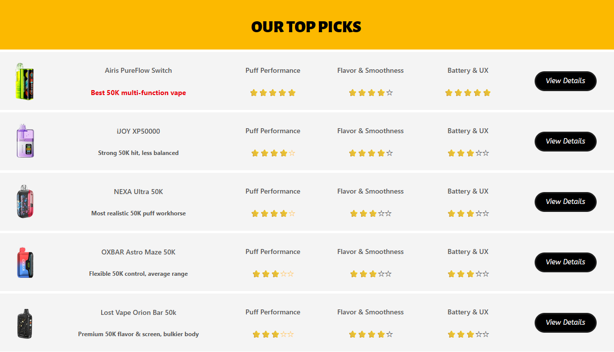 To see how today’s options stack up before you buy, check our updated Best 50,000-Puff Disposable Vapes 2025 list – it will keep evolving as 2026 launches arrive.